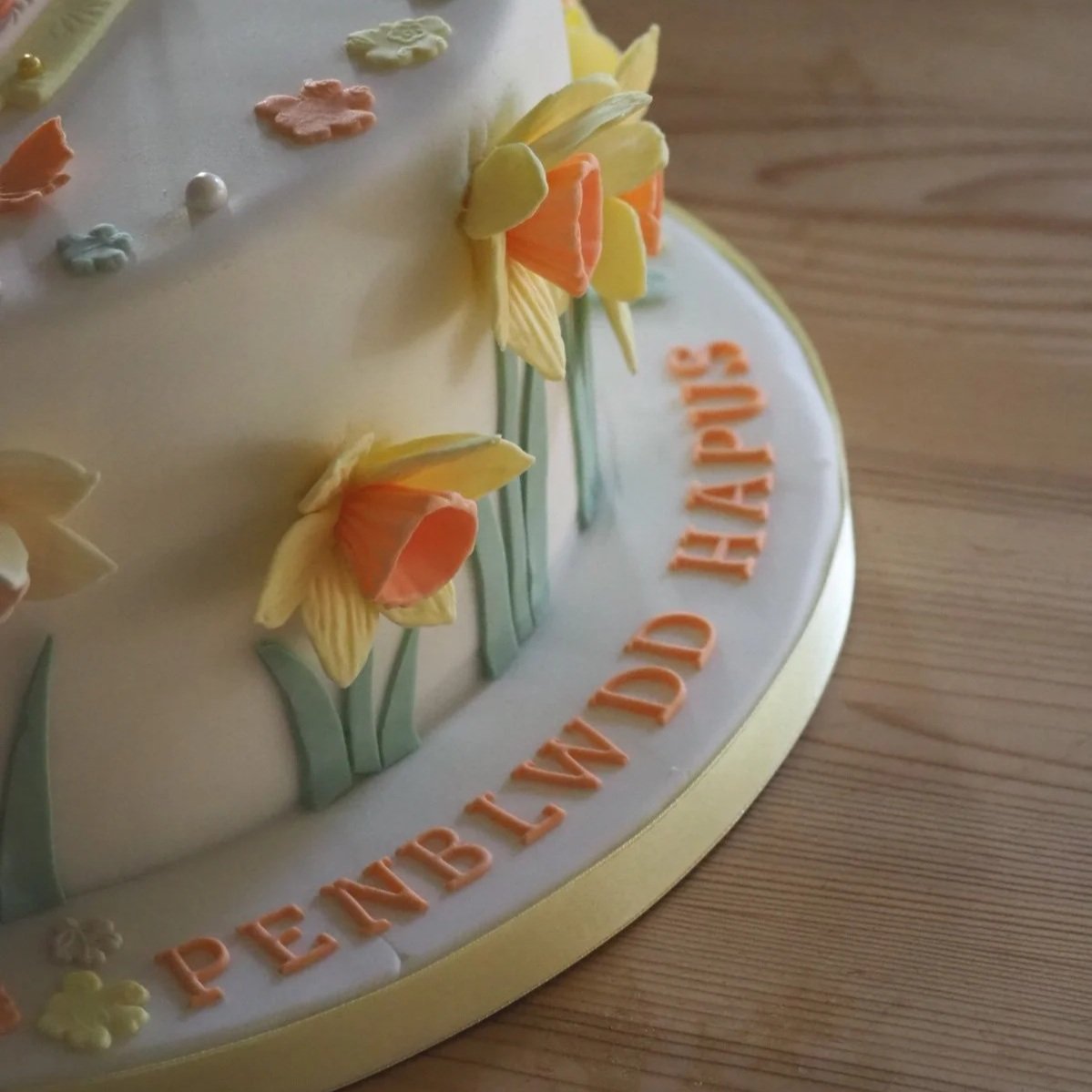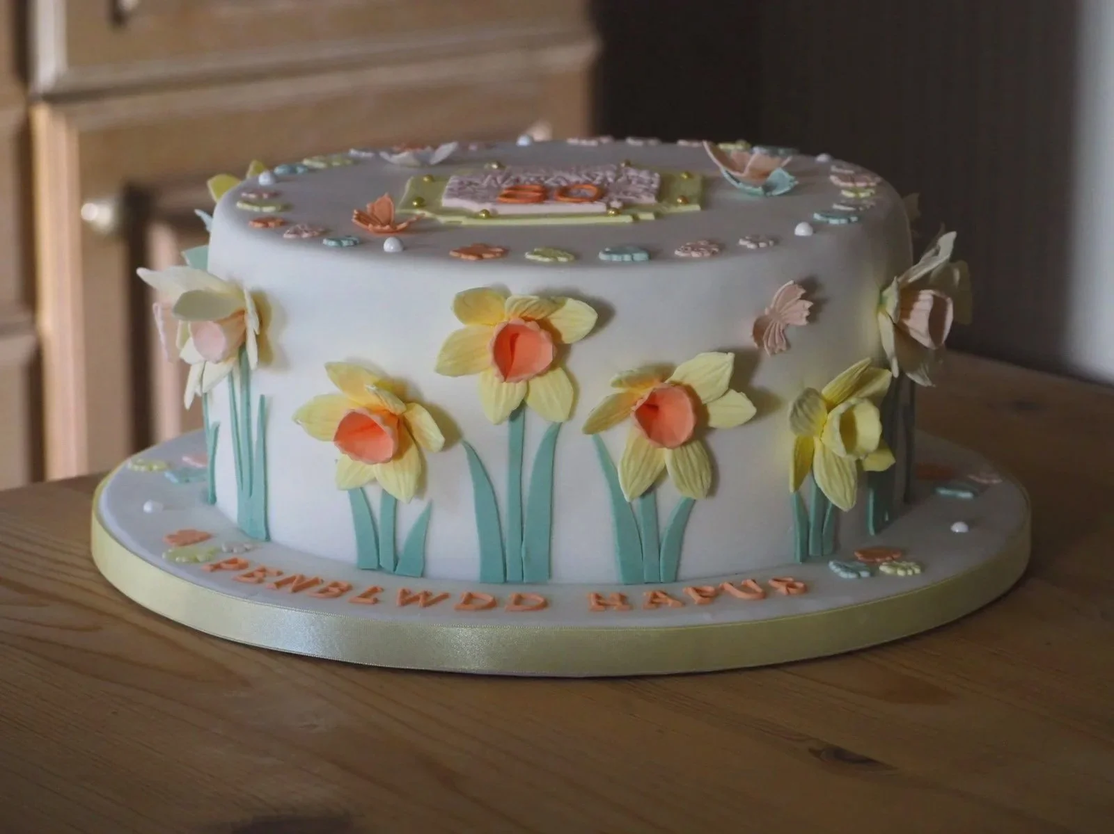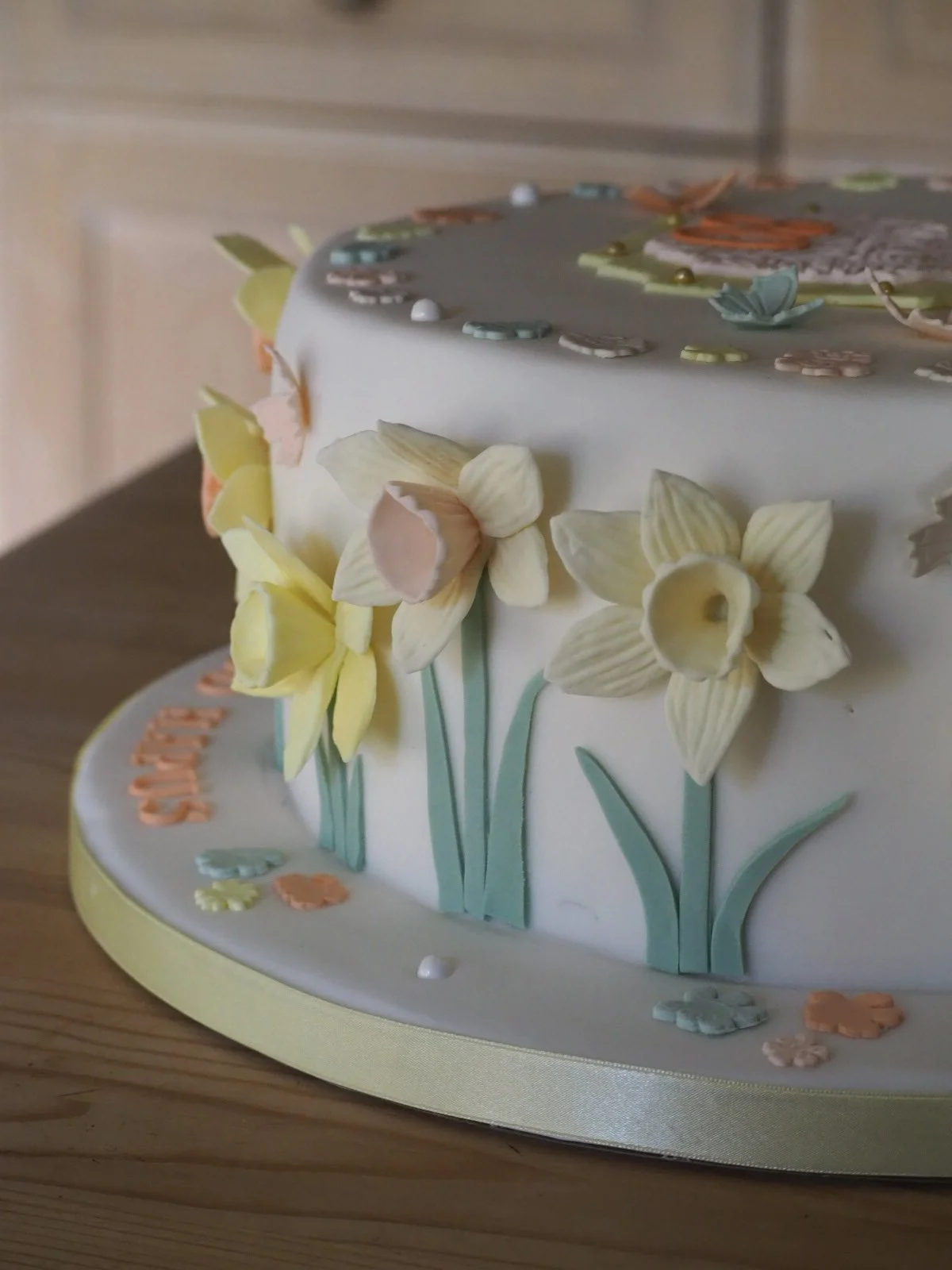 I couldn’t have been happier when my customer asked for these 3D daffodils around the side of her Mam’s special 80th cake. I baked a large vanilla sponge with buttercream and raspberry jam to serve the 25 guests at her gathering.