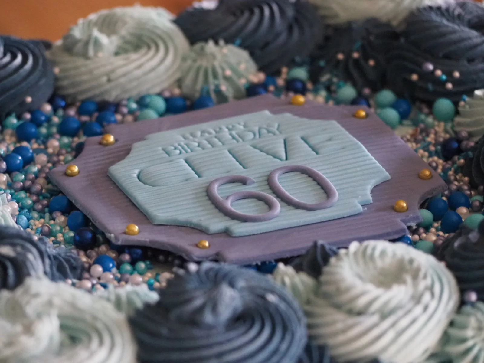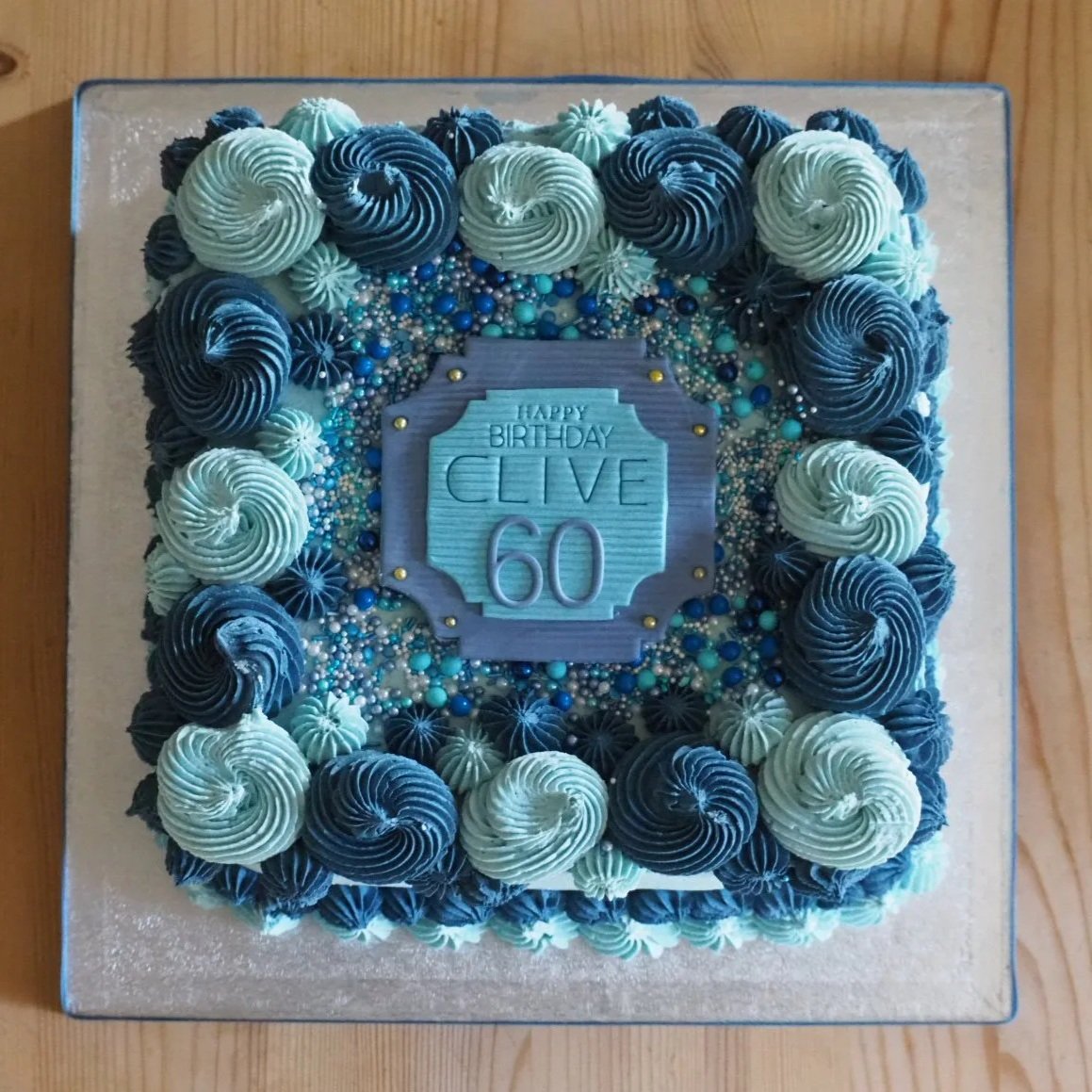 Clive’s wife chose shades of blue for his surprise 60th cake. We made a 10” Vanilla sponge filled with 3 layers of fluffy vanilla buttercream and raspberry jam.